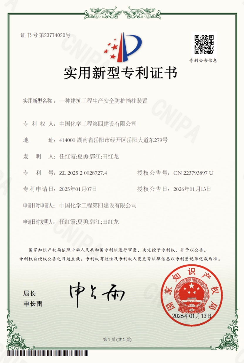 近日,從國(guó)家知識(shí)產(chǎn)權(quán)局傳來喜訊,由華北公司研發(fā)團(tuán)隊(duì)自主研發(fā)的“建筑工程生產(chǎn)安全防護(hù)擋柱裝置”,成功獲得國(guó)家實(shí)用新型專利授權(quán)。這是華北公司立足施工一線需求,推動(dòng)技術(shù)創(chuàng)新的又一具體成果。