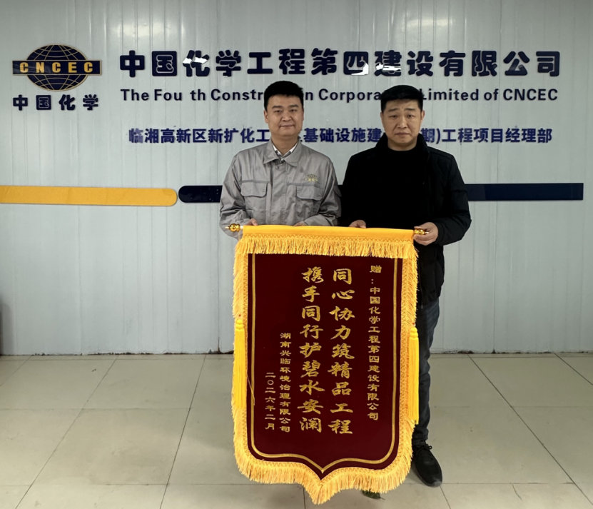 2月25日,湖南興臨環境治理有限公司向建筑工程公司臨湘項目部贈送“同心協力筑精品工程  攜手同行護碧水安瀾”錦旗,對臨湘高新區污水廠提能改造項目(一期)團隊的優異表現給予高度肯定。